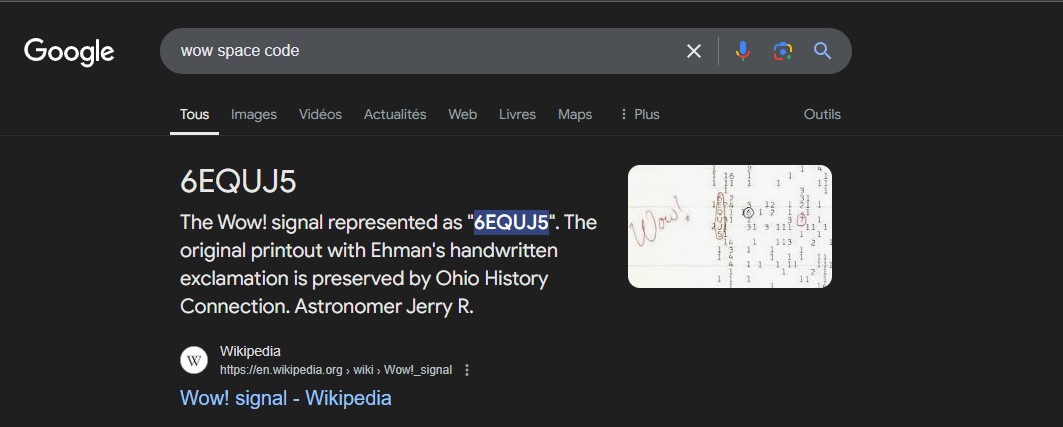 Google Search: As instructed, searching “wow space code” on Google yielded a result containing the string “6EQUJ5”. This was likely a hidden message or clue related to the challenge.