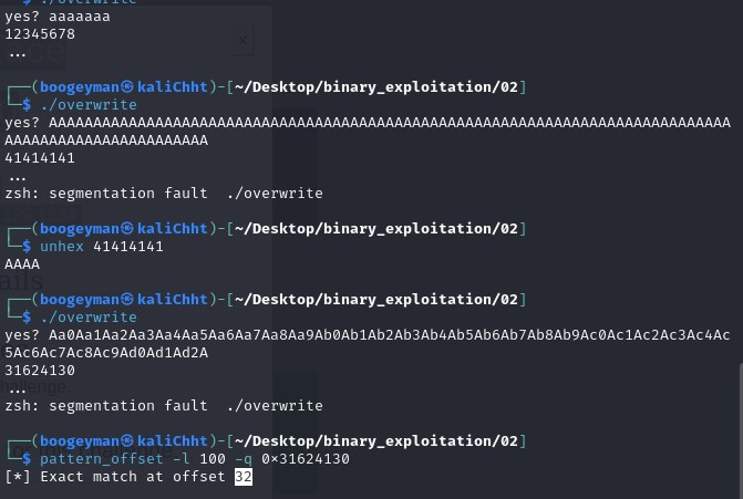 python -c 'print("A"*100)') resulted in41414141(hex for AAAA) being returned, confirming that the input was overwriting the EIP (Instruction Pointer) register.Finding the Offset: The